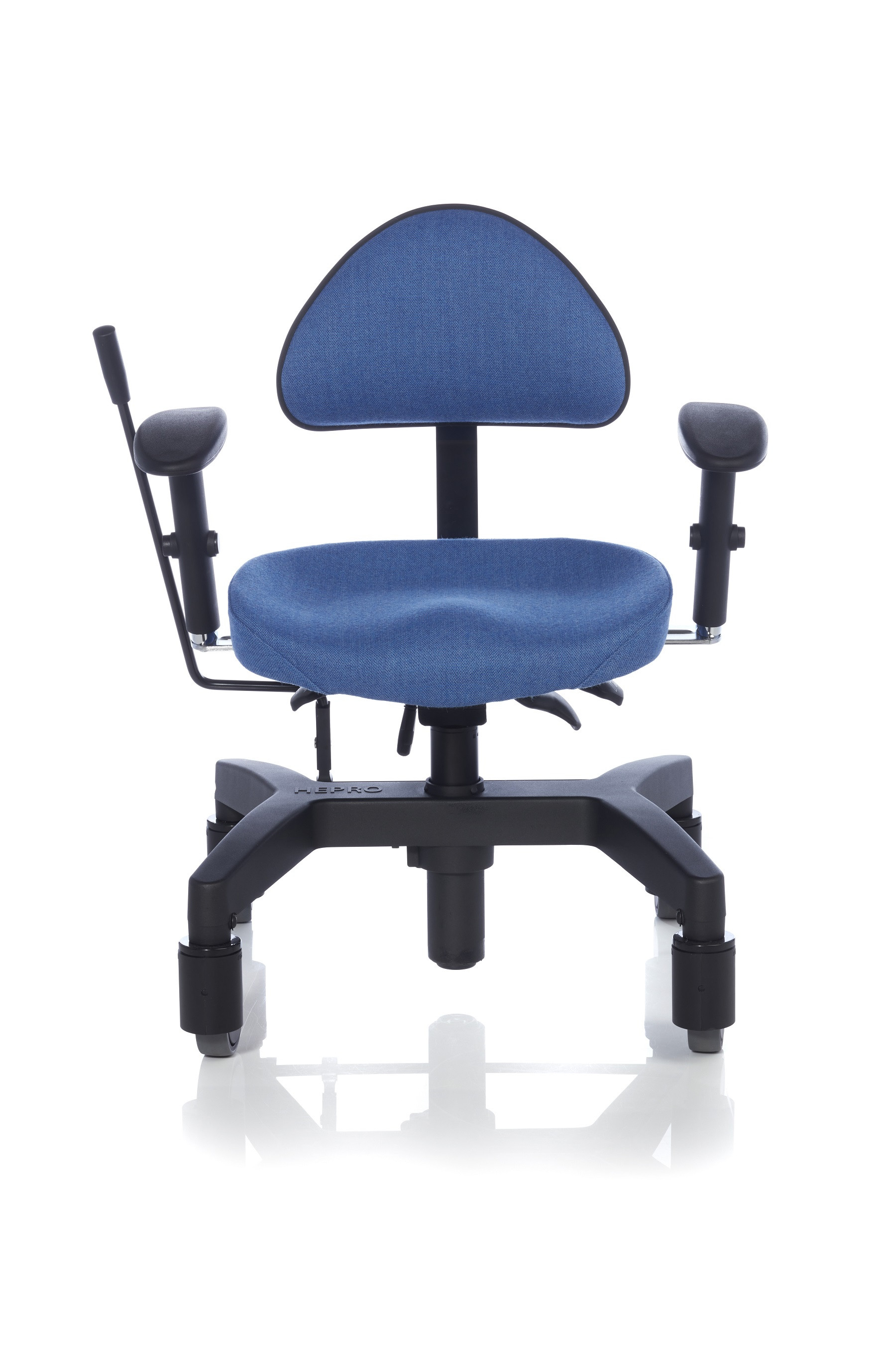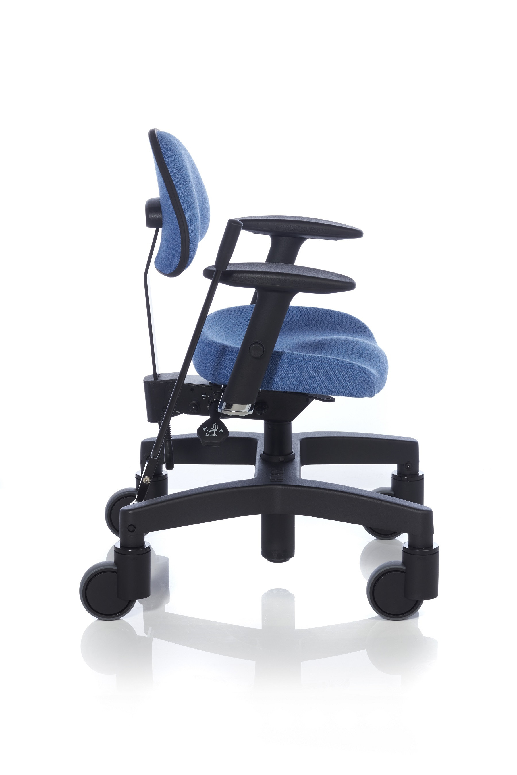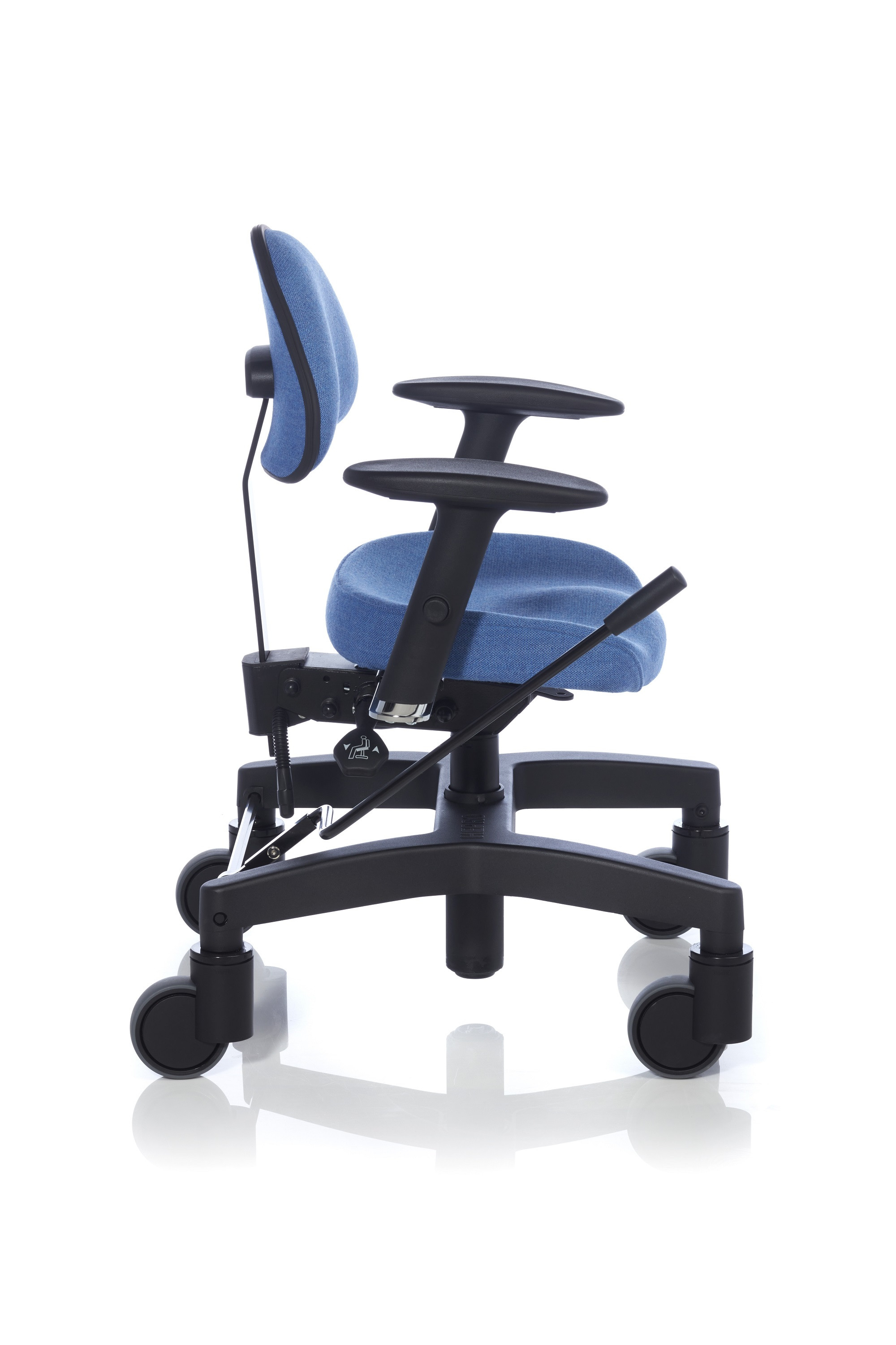 Ergonova Rehab Arbejdsstol med armlæn og ryglæn er en ergonomisk og særdeles komfortabel stol med kort sæde og ekstra lændestøtte - ideel til hæve-sænkebord. Rehab stolen er med gasfjeder til højderegulering og activ mekanisme med sædevip, flydende vip og ryglæn frem/tilbage og op/ned.