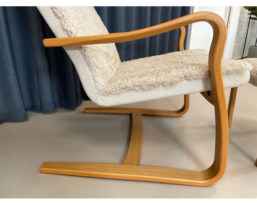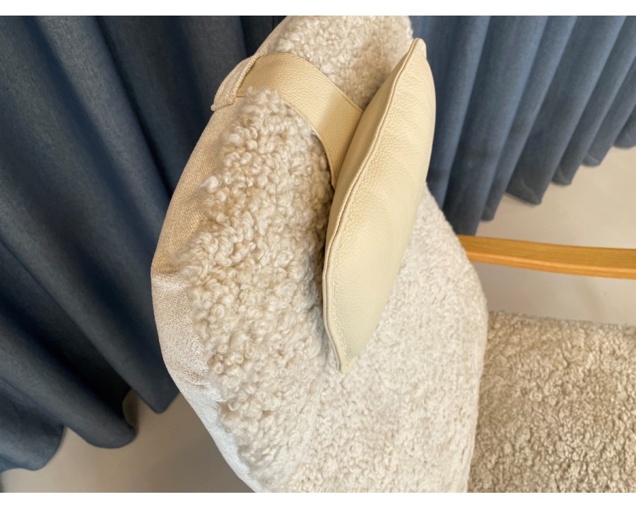 Stolen er ren fryd for øjet. Det pjuskede fåreskind komplementerer stellets bløde formsprog smukt og giver stolen en varm følelse.