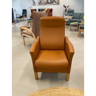 Milos 1 høj/Vip i Cognac læder 668/08 og ben i naturolieret egetræ er en stol med trinløs og regulerbar ryglæn og sæde.