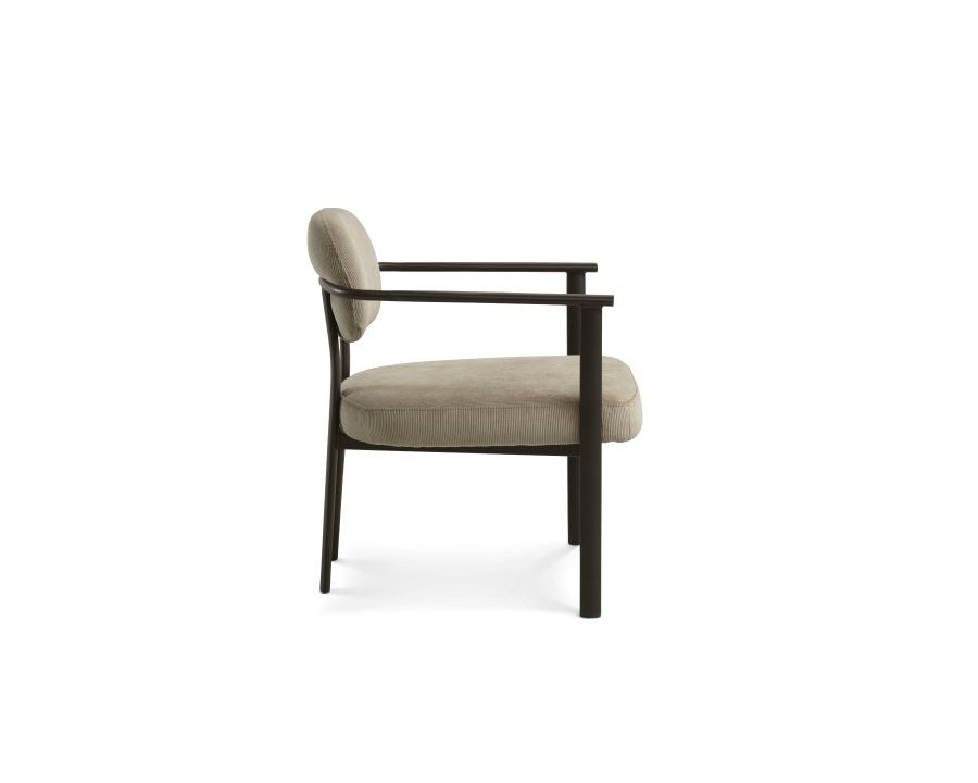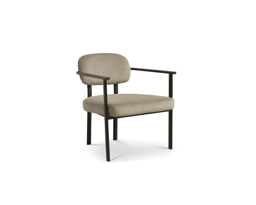 Den beige fløjlspolstring og det mørke metalstel skaber et roligt og elegant udtryk, perfekt til både stue og lounge.