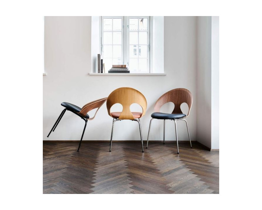 VL110 også kaldet "Øjestolen" er en utroligt flot og komfortabel spisebordstol. Stolens design er unikt, og det organisk formede ryglæn med kurver er imponerende flot at se på. Stolen har en komfortabel siddekomfort og designet balancerer lethed og raffineret æstetik. Sædet er polstret med læder fra dansk kvalitets producent, og alle træ overflader til VL1100 er FCS certificerede og produceret af danske leverandører. VL110 kan du tilpasse på mange måder, i farver og udtryk hvilket giver dig mulighed for at vælge hvad der bedst passer hjem til dig. Vl110 er ligeledes perfekt at tilføje i professionelle miljøer som mødelokaler, konferencerum eller receptioner. Stabelbar: op til 4 stk. (træstel er ikke stabelbar)
