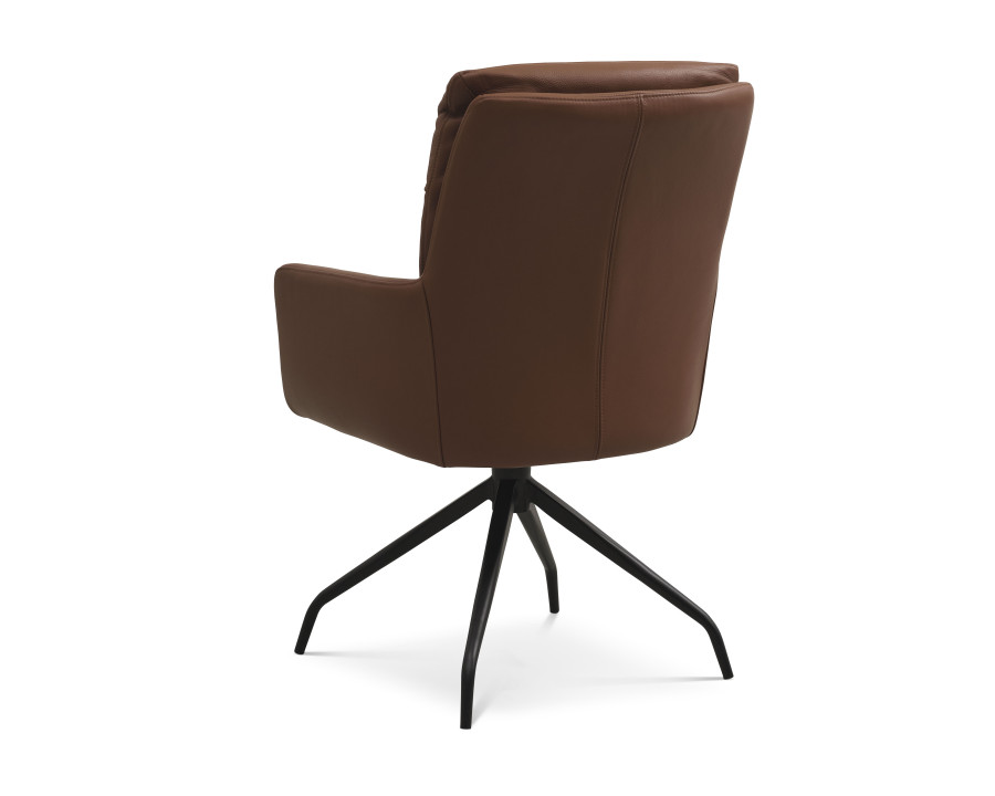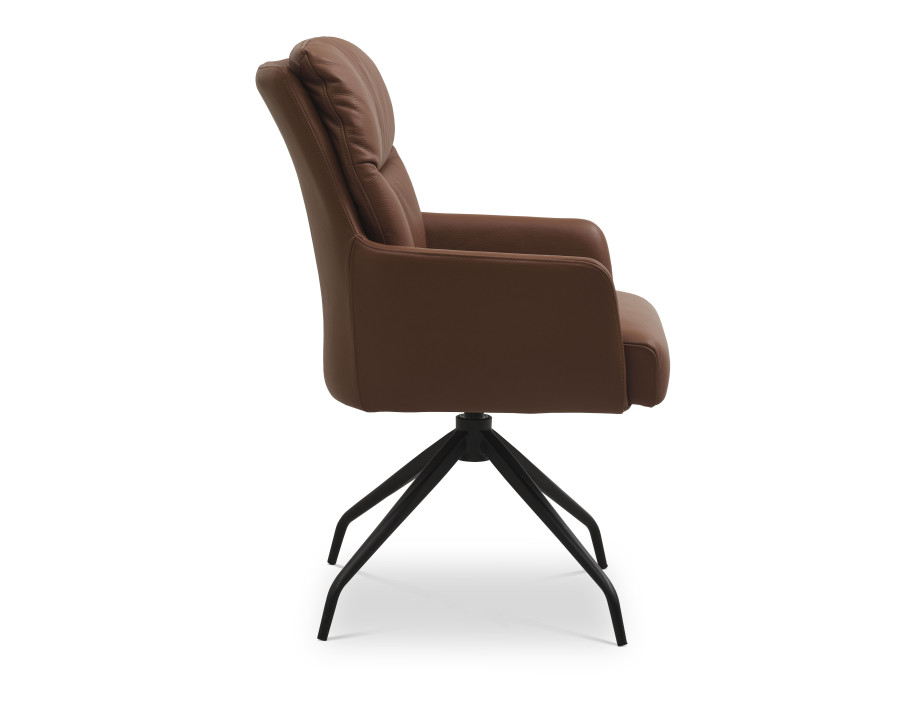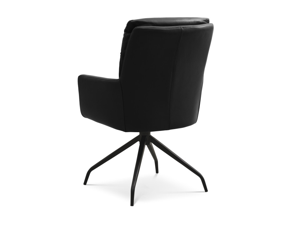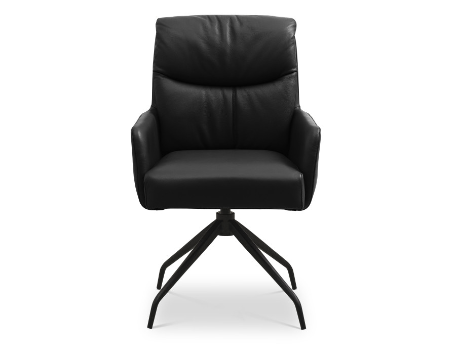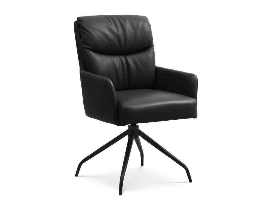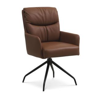 Lotus spisebordsstol med armlæn er en elegant og funktionel stol der vil bibringe elegance og komfort til dit hjem. Samtidig er stolen ergonomisk designet i sædeform og med afrundede bløde kanter der er med til at give stolen et eksklusivt look. Stolen fås i en lækker semianilin læder i farven sort eller cognac. Desuden er stolens stel et sort moderne metal drejestel der gør det nemt at rejse sig fra spisebordet, eller nemt at vende sig imod sidemanden ved bordet. Med stolen får du et stilfuldt og alsidigt møbel med fokus på komfort og æstetik.