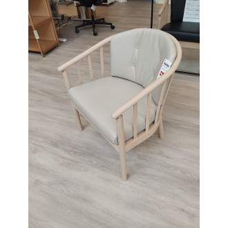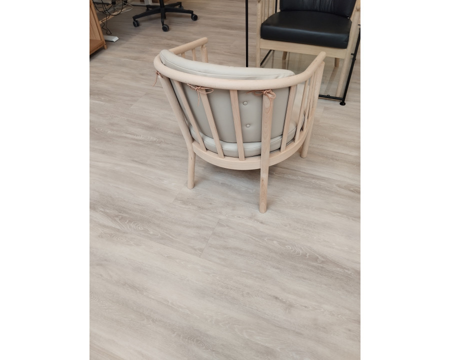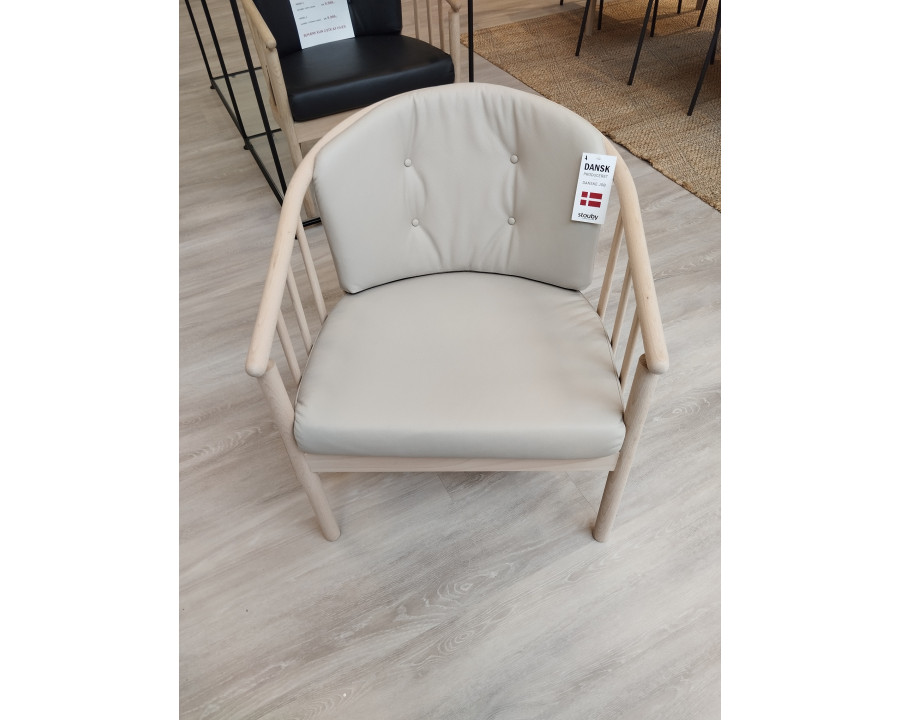 Vi har 2 stole i kombinationen Lyst (sand) læder og stel i massiv bøg, som sælges fra showroom Tilst.