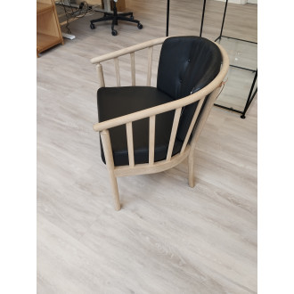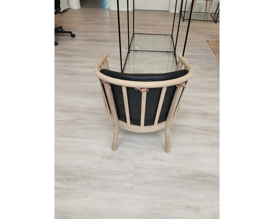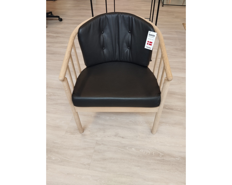 Vi har 2 stole i kombinationen sort læder og stel i massiv eg, som sælges fra showroom Tilst.