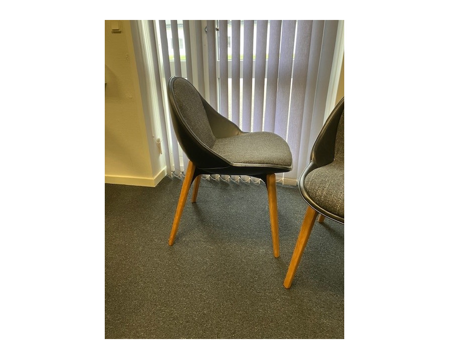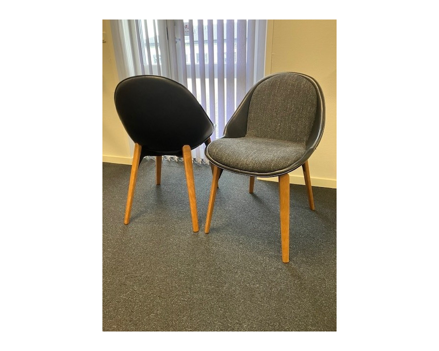 ARCH stolen er udført i tre materialer, træstel i eg, en dejlig sort boucle stof og sort kunstlæder. Spisestuestolen er designet med en kunstnerisk afrundet ryg, der fortsætter ind i sædet som en åbnet muslingeskal; indbydende og tilbyder en behagelig siddeplads. Sædet er monteret på et metalstel med stilfulde træben, der strækker sig lidt op ad ryggen, hvilket giver det et unikt og elegant udseende.